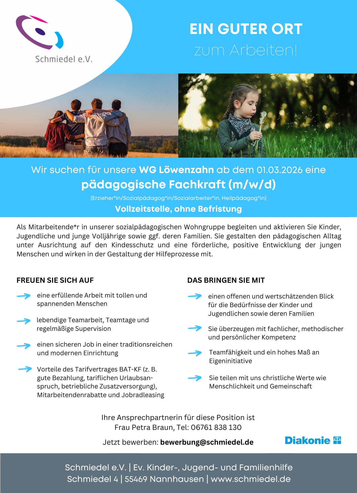 Wir suchen für unsere WG Löwenzahn ab dem 01.03.2026 eine pädagogische Fachkraft (m/w/d) und freuen uns über Bewerbungen von Erzieher*innen, Sozialpädagog*innen und Heilpädagog*innen.